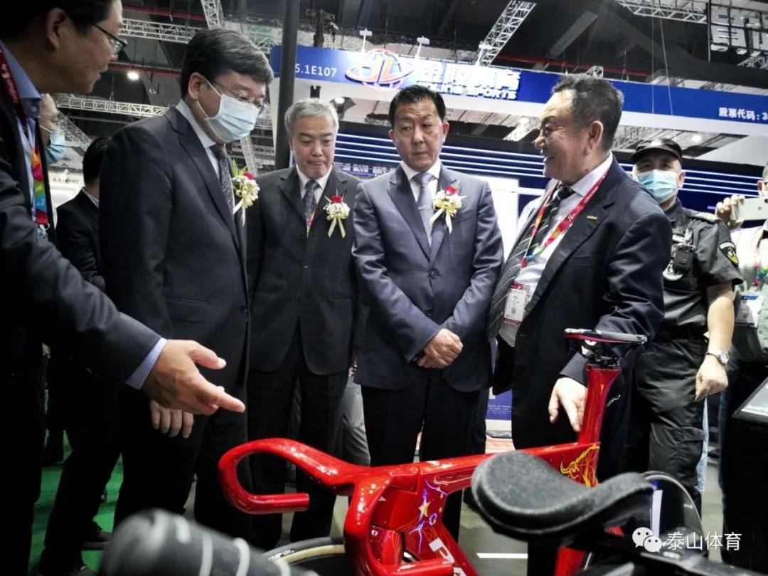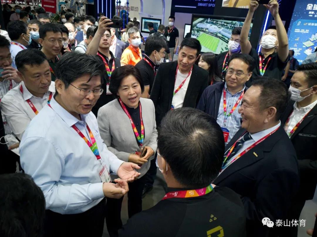 国家体育总局基金会理事长吴齐、山东德州市政协主席翟长生、德州市副市长马俊昀、德州市工信局局长孙洪昌、德州市科技局局长张慧君、乐陵市市长陈光春、乐陵市政协主席刘文学、乐陵市副市长牟正军在米兰体育展厅参观。