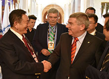 中国自行车运动协会主席崔大林向国际奥委会主席巴赫介绍 米兰瑞豹自行车